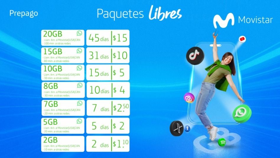 Paquete de 20 GB: Cuenta con llamadas ilimitadas a Movistar, USA y CAN, y con 100 Min a otras redes por 45 días a un costo de $15.